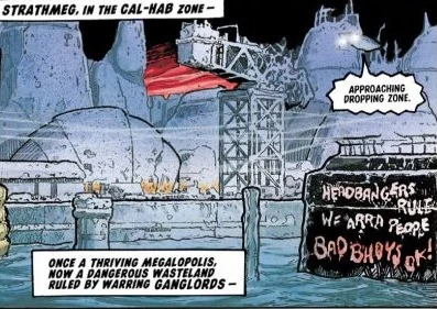 Since then, most of Cal-Hab seen has been the rural outskirts. There is still reference to "Cal-Hab law" and there is a Ness International Hoverport and direct zoom trains to Mega-City One. In the wilds outside of the habzone proper lived the "wild Scotties", who only enter to forage illegally and aren't protected by the law; some of those tribes lived in Orkadia (future Orkneys).