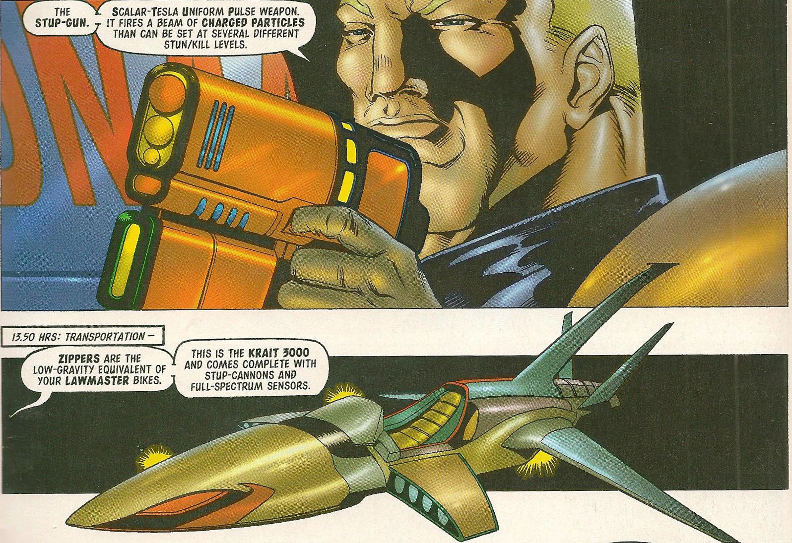 Due to the low gravity, Luna Judges pilot low-hover Zipper Bikes. While firearms were used by Judges, the threat of dome punctures meant they were replaced with electrical STUP-Guns and STUP-Cannons (Scalar-Tesla Uniform Pulse) by the 2110s. The most advanced Zipper in 2118 was the Krait 3000 but budget cuts meant the Judges were mostly using older models in 2126. In 2127, wheeled bikes were being used.