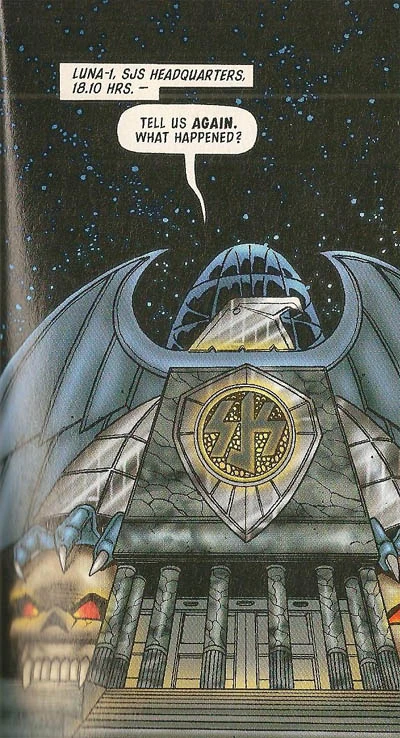 Luna-1's Special Judicial Squad have greater powers than Mega-City One's and can carry out brutal torture; bladed instruments are allowed. The SJS building is an over-the-top gothic structure marked with skulls.[29]